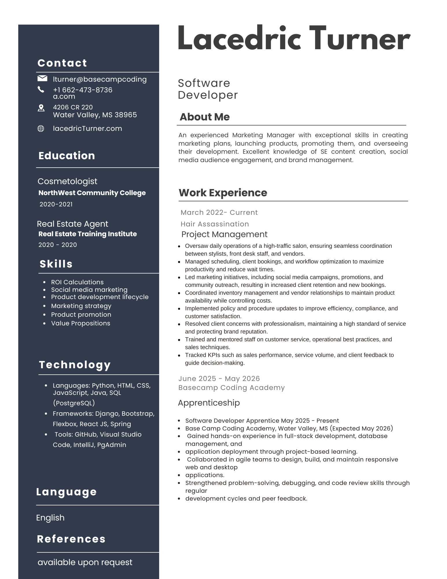 My name is Lacedric Turner. I’m a project manager with experience in software development and creative design, as well as managing client-focused operations. I’m passionate about bringing ideas to life and ensuring projects run smoothly from start to finish. I’d love the chance to connect and see how I can add value to your team.